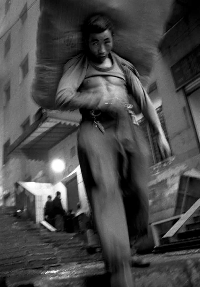 Dans En quête d’altérité, le visiteur se promène ensuite sous les «Titans », ces porteurs qui vacillent dans le flou, écrasés par leurs ballots de près de cent kilos. « à l’heure où la Chine s’apprête à renverser l’ordre du monde, c’est à dos d’hommes, les Titans, que se construit le nouvel empire. » confie Christophe Bourgeois de sa voix douce.