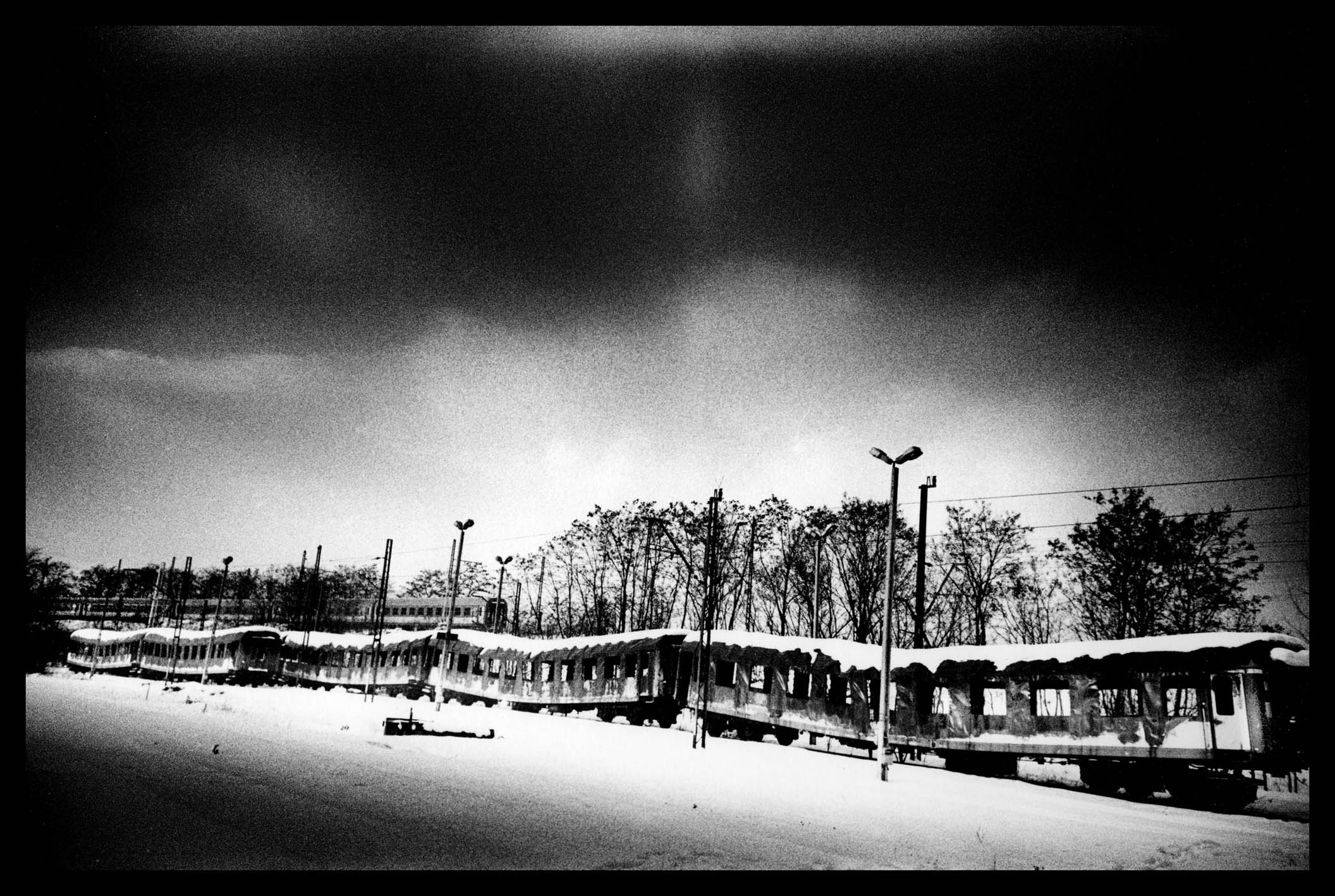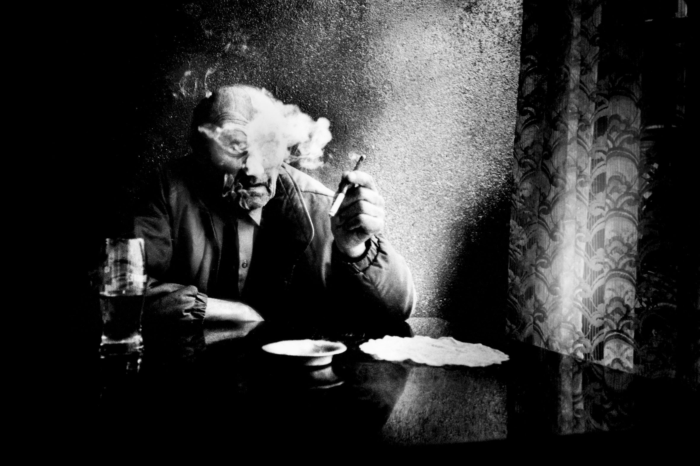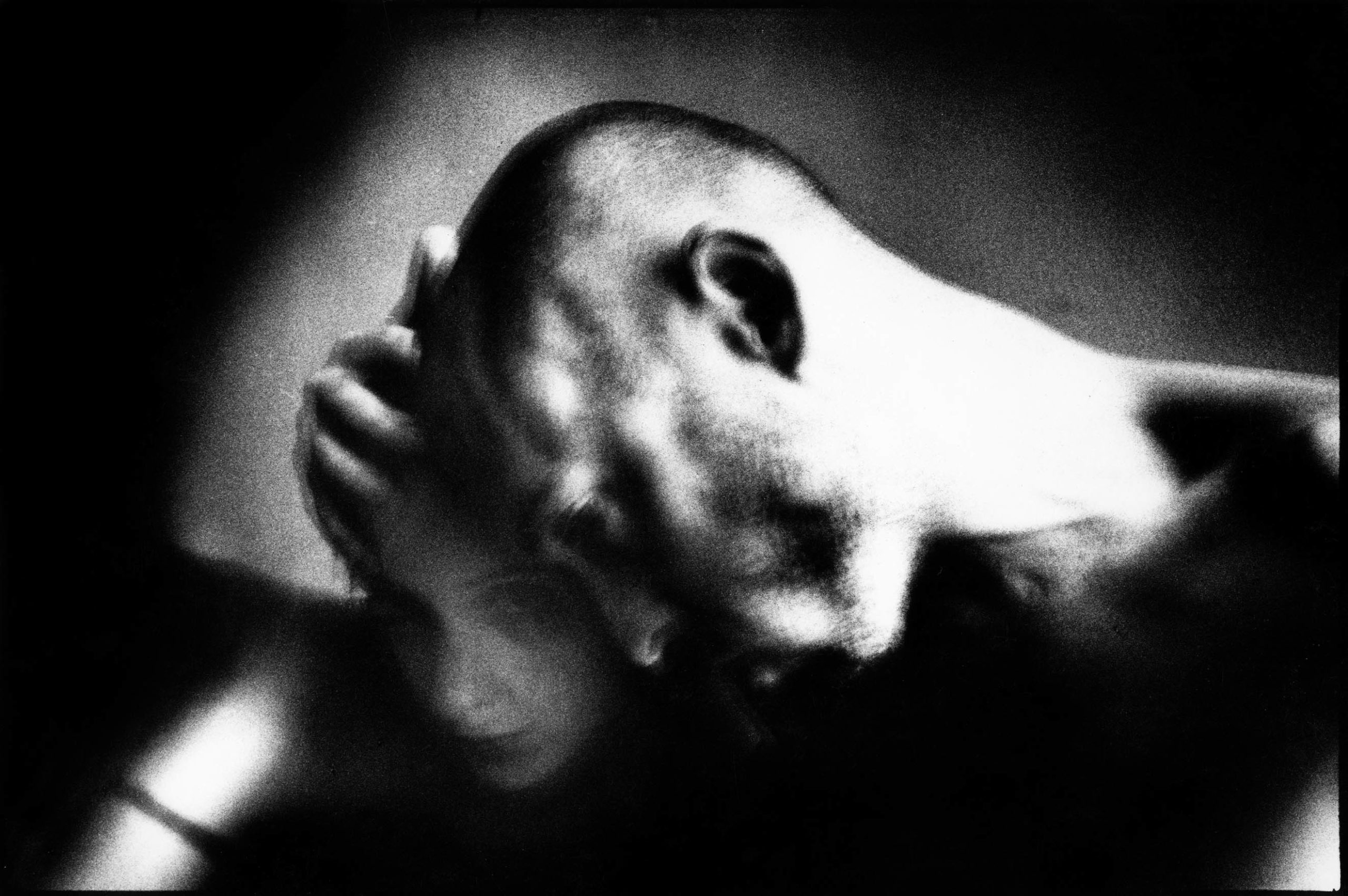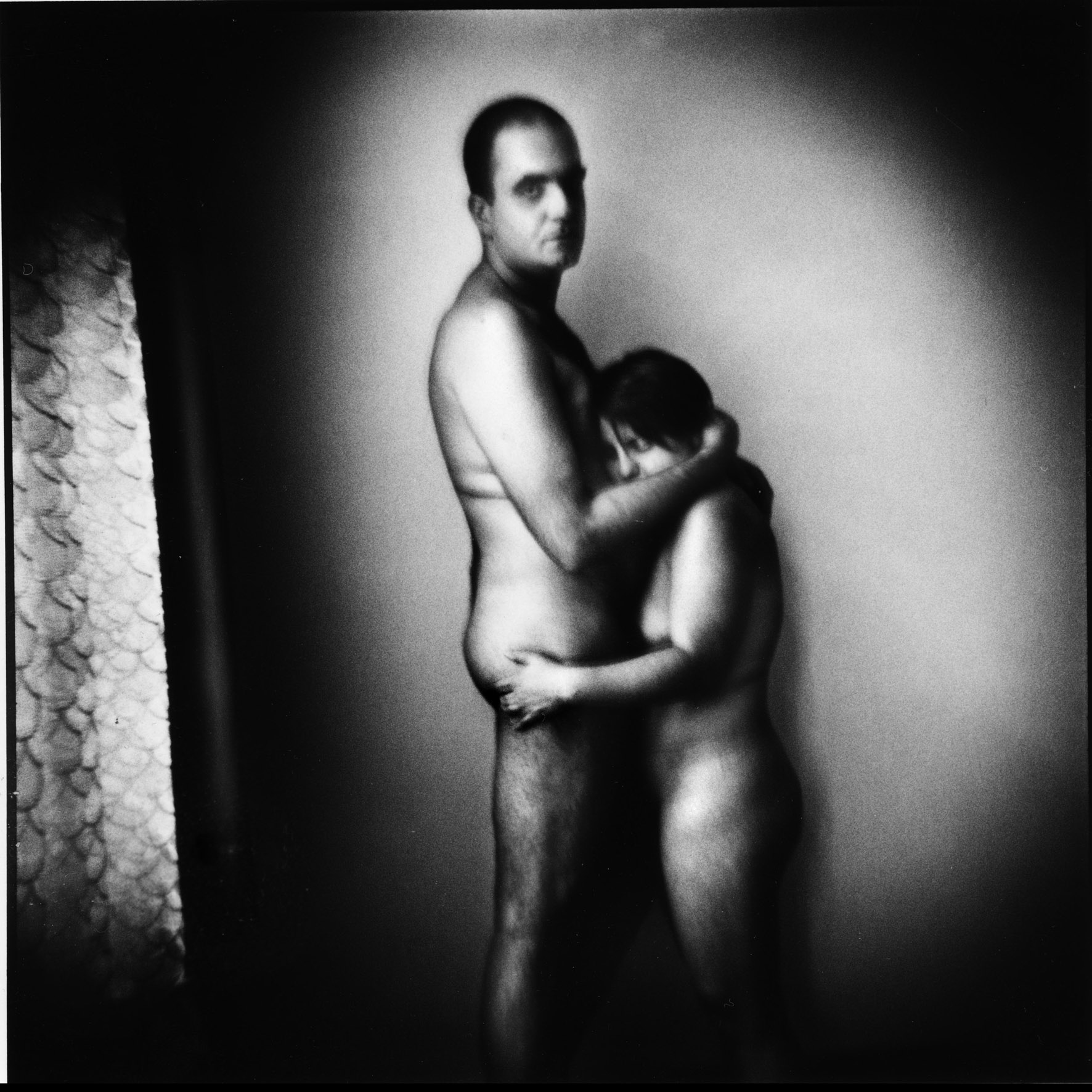 Une femme nue, les bras autour d’elle, ses mains sur le ventre. Figée, elle lève la tête, surprise, étonnée. Dans son regard, une expression inévitable : de l’amour, de la peur ou de la tristesse ? Nu, l’homme est agenouillé sur un lit. Une posture de supplication, une étrange position. Une entité vague qui s’efface derrière un écran de rayures et un sentiment de souffrance qui s’en détache. Dans un coin, un vieil homme attablé, une cigarette à la main. Des volutes de fumée blanche, un verre, un besoin, une solitude. Deux têtes rasées, le portrait de l’artiste et celui d’une femme. Une curieuse osmose et son reflet troublant. Et des paysages. Enneigés, perdus, sombres et silencieux. Une douceur équilibrée, une foi en la beauté perceptibles dans ces photographies d’un monde si brutal.