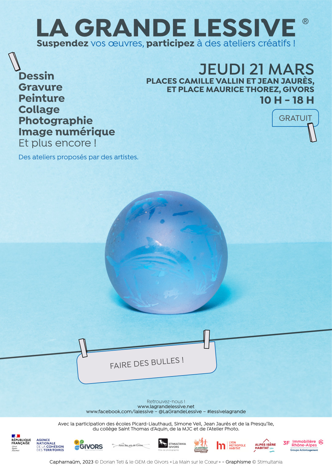 C’est le retour de la Grande Lessive à Givors ! 3e édition de cet événement d’art participatif organisé par Les Amis des arts, Stimultania et les Incroyables Comestibles. Rendez-vous jeudi 21 mars sur la place Camille Vallin et Jean Jaurès et Place Maurice Thorez, pour des ateliers créatifs et un accrochage de vos œuvres dans l’espace public !
